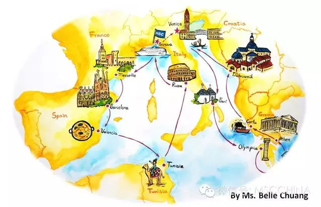 Belle跟随着MSC SPLENDIDA 辉煌号,沿途体验欧洲各城风情、北非阿拉伯情调、地中海浪漫小镇,就此展开“一天一国”的奇幻邮轮之旅。下图为Belle笔下的地中海风情。