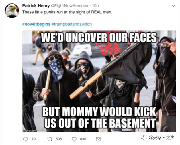 推特上如今的画风是各种嘲笑这些在大街上耀武扬威的蒙面人,现实生活中不过是待在家里的啃老一族。