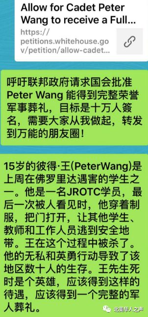 他离开了,他的家人充满了伤痛。而为他英雄事迹所震撼的华人朋友们则展开了行动。他们纷纷转发信息,呼吁联邦政府批准为Peter Wang举行完整的荣誉军事葬礼。Peter原本便是ROTC(The Reserve Officers' Training Corps ,预备役军官训练营)的学员,如能为他举行这种葬礼,那也是对他曾经梦想的最好安慰。