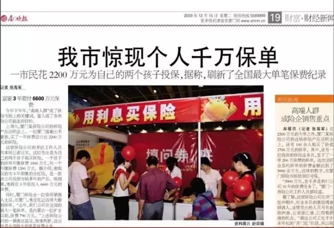 Yanzhen-2187 02/08 7398一位福建富豪出手豪放,买了一年保费总计达2200万元的保险。这家保险公司的多位工作人员向记者证实,这位先生是为自己的两个孩子购买保险,一个孩子的保单年缴保费1000万元,另一个年缴保费1200万元。据介绍,富豪购买的是一款该公司投放市场多年的产品。按测算,他将在未来3年里投入6600万元的保费。