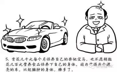 肯花幾千元每個月保養自己的賓士寶馬,也不願稍微花幾百元營養品保養下自己的身體,因為覺得開個漂亮的車,比臃腫的身體,棒多了。