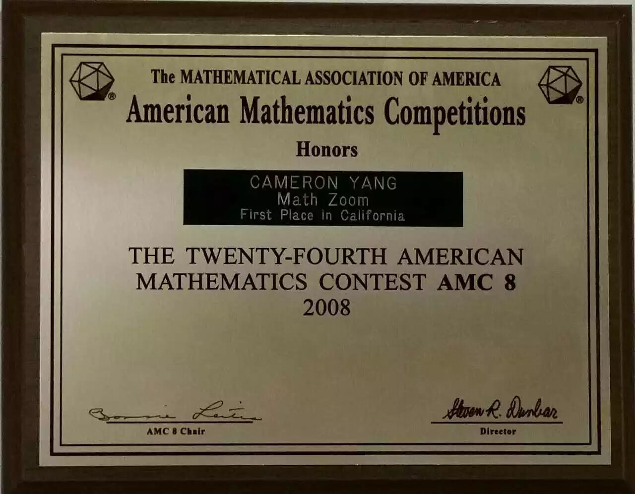 (注:AMC8是AMC系列中相对独立的比赛,不涉及晋级。作为奖励,满分的学生会得到所在州第一名的奖匾;其他高分学生会有相应的证书或奖章。如下图:)