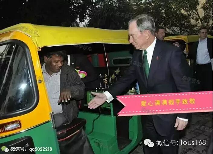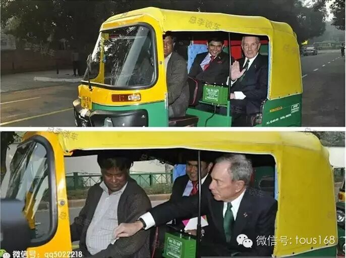 纽约市长,355亿美元的富豪,在印度新德里,乘坐三轮车去饭店。