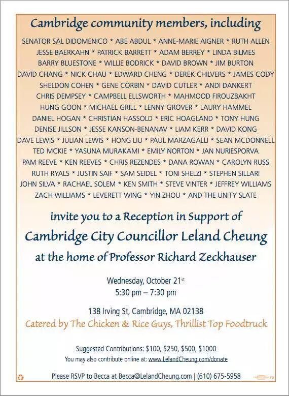 10月21日下午5点30分至7点30分,剑桥市议员Leland Cheung及团队将于麻州剑桥市举行主题为”Cambridge City Councilor Leland Cheung-at the home of Professor Richard Zeckhauser"的政治竞选筹款会。