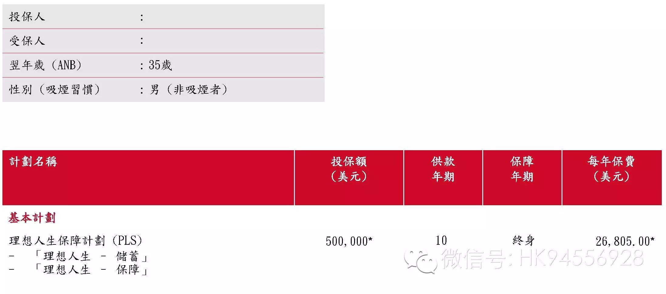 男,35岁,非吸烟人士,为了确保家庭财务的稳健性,选择每年存入26,805美金,保费每年保证不变,存10年的人寿保障计划,本金共存款268,050美金,拥有人寿保障50万美元,保终身。