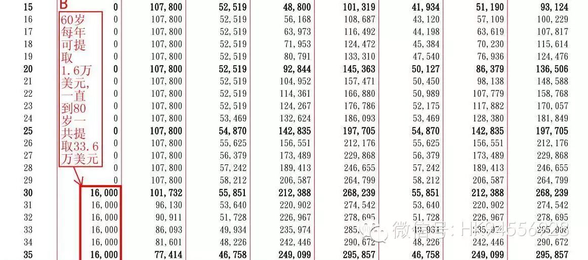 如果客户从60岁开始,从保单中每年提取16,000美元,直到80岁,20年总共领回336,000美元。