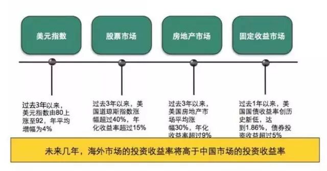 近几年来,海外环境开始缓慢复苏,比如美国的就业和房价开始上涨,加之人民币上涨预期有限,大众富裕阶层应该加大海外资产配置比例。就美国的房地产市场和固定收益市场而言,近三年以来,美国的房地产增幅达到30%,换算成年化收益大概是9%。固定收益市场如果换算一下的话,如果2014年初投资美国国债,年末的收益应该超过5%。此外,过去三年以来,美元指数由80飙升至92,年均增幅达4%;美国道琼斯指数涨幅愈40%,年化收益率超15%。从今年海外资产火热程度来说,2015年应该是海外资产配置的元年。其实从今年三四月份开始,国内的QDII额度就越来越紧俏,抢占QDII通道的机构也越来越多。去年,全球高净值人群24%的财富投向海外资产,中国的高净值人士只有5%的财富投向海外资产,海外资产配置比例偏少,空间广阔。