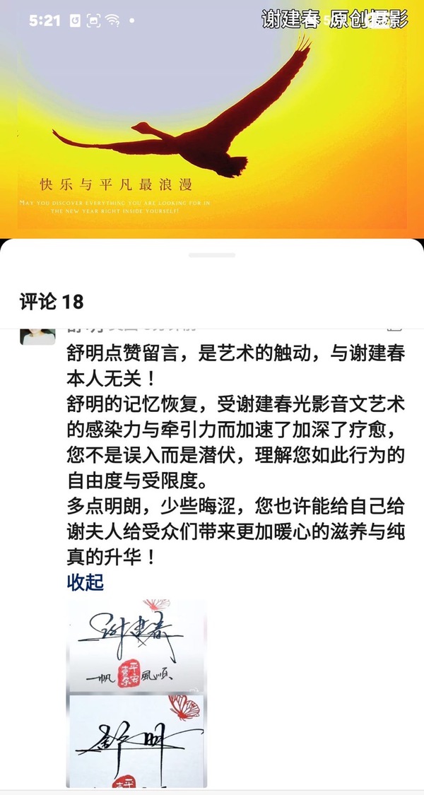 虽然一直到今年的二月,摄影诗歌/谢父之署名,让我感动也就特别特别想起父亲的重要性,加上从一开始谢的私信让舒明觉得不是陌生人,所以她与班长又记起来,两次与东北人有过的彼此如贵人的经历。见附上的截图。如果谢恰好是其中的一人,那也真的是太巧 !本来舒明是希望见到谢建春本人,看见眼神再决定是否提问的~~