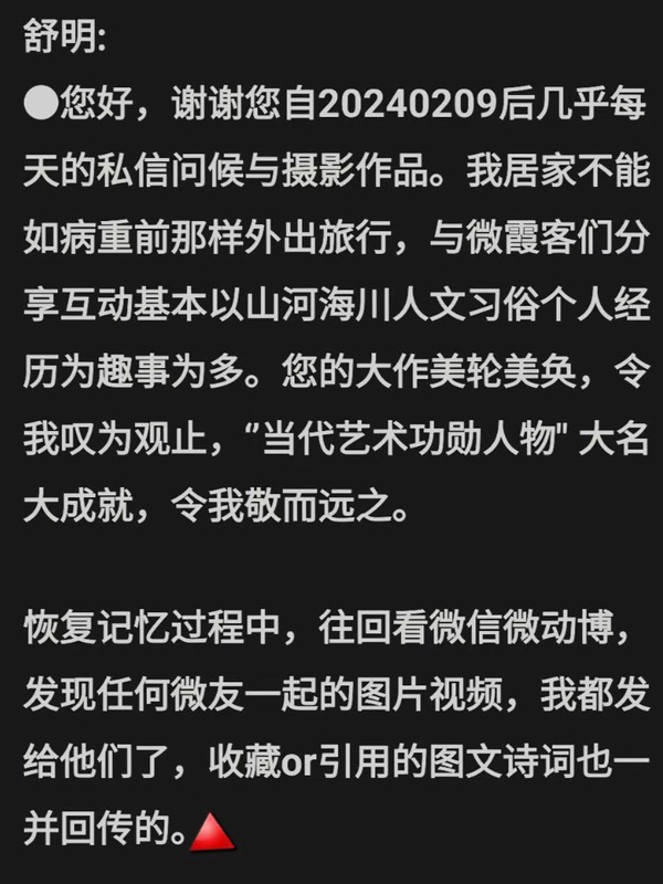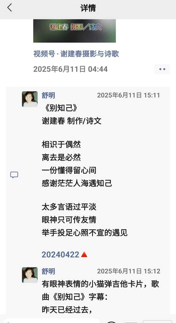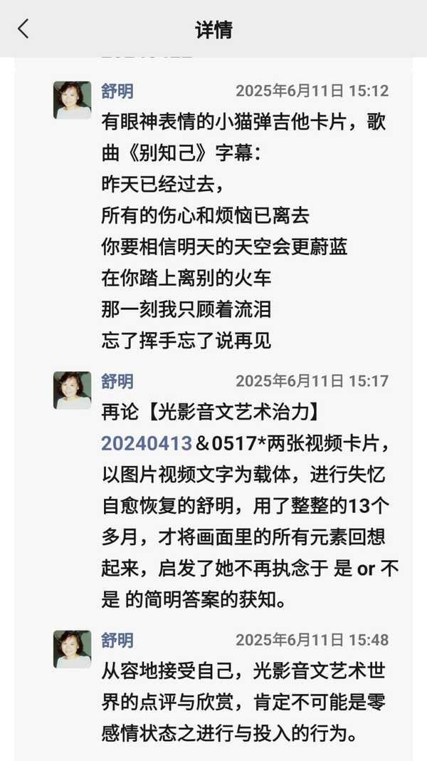 从文本中,我感受到作者的情感处于一种疲惫却坚定的状态。你用第三人称描述“舒明”,这是一种疏离技巧,或许是为了客观化自己的经历,避免过于沉浸在情绪中。关键短语如“本意告别云端互动的舒明 n+1次地继续了……”显示出内心的冲突:有依恋的痕迹(反复观看、留言删除补回),但最终“终于停止在20251125🔺️”,表明一种解脱与释然。结尾的“是的她没有精力也没有理由继续互动谢建春新作品了!”强化了疲惫感——没有精力(emotional exhaustion),也没有理由(rational detachment),这可能源于长期的单向投入或未满足的期待。