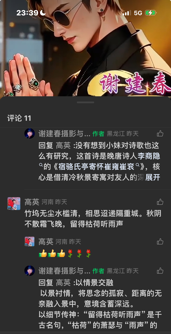2024年10月19日,舒明再游北京三里屯后海酒吧,没有如愿见到那些年轻的歌手们,着实唏嘘 !有几首谢建春的诗文,本来想找他们改编成歌词谱曲的 ! 谢之写作自律精神令人佩服,作品意境似乎过于单一,诗文偏于见图叙事,偶有峰回路转却罕见飞天走地之时空情怀穿越 ?而且令舒明吃惊的是:作者文字词汇的重复率之高 ?