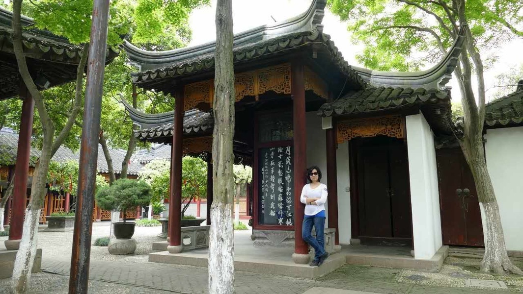 寻寻觅觅,我一弯一转地走着,问了好几个人才终于找到了“枫桥”。站在桥对面的河湾处,我放眼望去。。。寒山寺的塔尖在正前方的树后,影影绰绰。寺院钟声仍然依稀可辩。右边的远处是方才那座“江村桥”,左边的近处则是“枫桥”。看着看着我恍然大悟了!我立足之处就是一千二百年前张继所在的GPS坐标! “江”、“枫”二桥相对,还有那天夜晚的渔火。公子的脑海中便出现了“江枫渔火对愁眠”的千古绝句!喔~!这简直是太不可思议了!这一回,我真的是站了许久,不肯离去。没说的,那一晚我姑苏城外,枫桥夜泊。。。