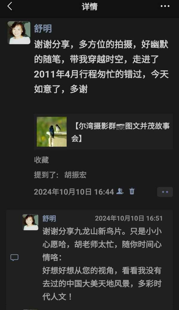 20241209 舒明留言给胡老师(她把胡谢当成一个人): 闲云野鹤-胡振宏(香港&上海)