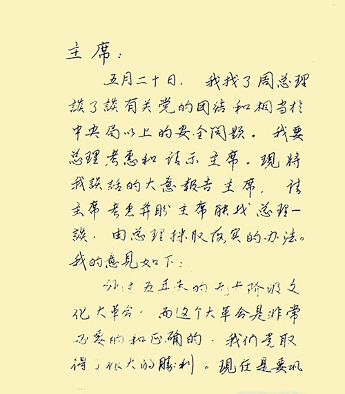 五月二十日,我找了周总理谈了谈有关党的团结和相当于中央局以上的安全问题。我要总理考虑和请示主席。现将我谈话的大意报告主席,请主席考虑并盼主席能找总理一谈,由总理采取落实的办法。我的意见如下: