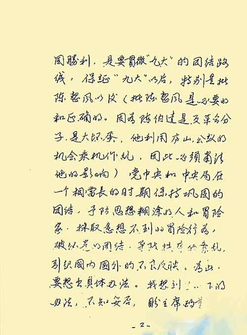 经过五年来的无产阶级文化大革命,而这个大革命是非常必要的和正确的,我们党取得了很大的胜利。现在是要巩固胜利,是要贯彻“九大”的团结路线,保证“九大”以后,特别是批陈整风以后(批陈整风是必要的和正确的。因为陈伯达是反革命分子,是大坏蛋,他利用庐山会议的机会乘机作乱,因此必须肃清他的影响)党中央和中央局在一个相当长的时期保持巩固的团结,预防思想糊涂的人和冒险家,采取意想不到的冒险行为,破坏党的团结,导致秩序的紊乱,引起国内国外的不良反映。为此,要想出具体办法。我想到了以下的办法,不知妥否,盼主席酌量。