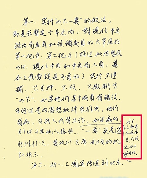 第一,实行“四不一要”的做法。即是在暂定十年之内,对现任中央政治局委员和候补委员的大军区的第一把手、第二把手(经过批陈整风以后,现任中央和中央局人员,基本上应当说是可靠的)实行不逮捕、不关押、不杀、不撤职等“四不”,如果他们某个成员有错误,可经过党内思想批评来解决,他们有病,可找人代替工作,如果病故,则提升其他人接替。对于久病要求退休者,则按退休干部处理。“一要”就是遇特殊情况,要执行主席面授的机动指示。
