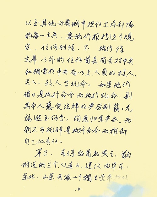 第二,将以上规定传达到北京,以至其他必要城市担任卫戍部队的每一士兵,要他们根据这个规定,任何时候,不执行除主席以外的任何首长有关对中央和相当于中央局以上人员的捉人、关人、杀人等乱命。如果他们借口是执行命令而执行乱命,则其本人应受法律的严厉制裁。无论逃至何处,均应归案严办。而绝不可托辞是执行命令而推卸自己的责任。