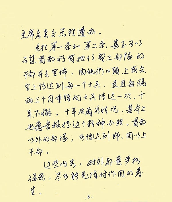 关于第一条和第二条,甚至可以召集首都所有担任警卫部队的干部开会宣布,由他们口头上或文字上传达到每一个士兵,并且每隔两三个月重复向士兵传达一次,十年不懈。十年后再看情况,基本上也应当根据这个精神办理。首都以外的部队,可传达到师、团以上干部。