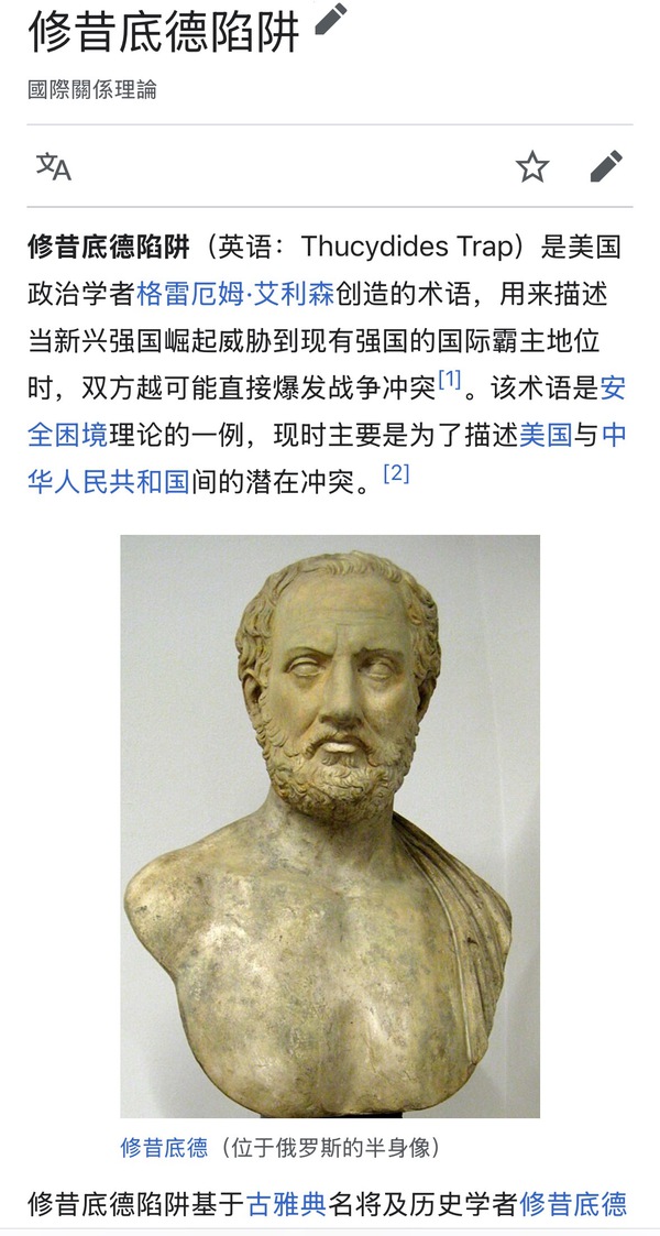 “修昔底德陷阱” 基于古雅典名将及历史学者修昔底德的一段话,修昔底德认为雅典和斯巴达之间的伯罗奔尼撒战争不可避免,因为斯巴达对雅典实力的增长心生恐惧。为支持这论点,艾利森在哈佛大学贝尔弗科学与国际事务中心领导了一项研究,该研究发现,在新兴大国与现有霸主竞争的16件历史实例中,有12件最终以战争告终,然而这研究受到了相当大争议,学术界对修昔底德陷阱的理论意见不一。