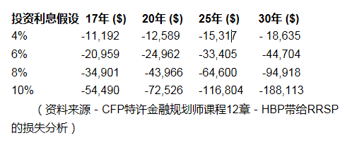 从以上表中可以观察到,如果您的RRSP投资可以实现每年6%的增长,等您15年后(即第17年时)还清所有RRSP的欠款,您的RRSP价值比起如果不取这笔钱一共损失了20,959加币的增长。这主要是由于您丧失了投资时间价值,而在此15年间,投资是可以免税复利增长的。损失的这20,959加币,继续扩大损失,如果到第30年,您的总体损失将达到44,704加币。当您搬进环境优雅的大房子时,您是否想过,自己在预支将来的退休金?