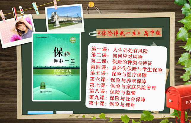 《保险伴我一生—中学生保险知识》一书是为推动保险教育进入中小学课程,普及保险知识,提高学生风险和保险意识,由中国保监会、中国社会科学院、英国保诚集团等单位联合组织编写的,于2013年9月1日正式列为中学生保险教育知识读本。