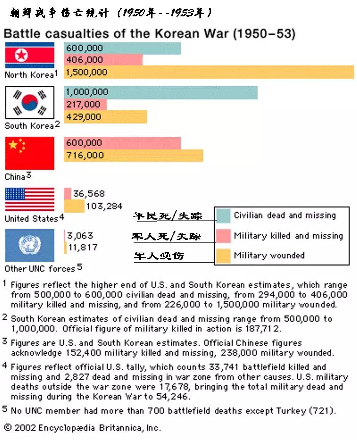 韩战是一场土地,制度争夺战。在战争前后的土地变化由图可见: 数字为日期,红色为苏中朝9国控制地盘,绿色为韩国24联合国夺回地盘。为了这个地域变化,双方付出了惨痛代价,让我们一起看看数据——
