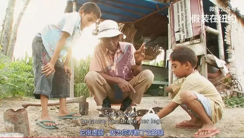 镜头一转,他蹲在地上,教育两个年幼的孙子要对小动物有爱心,不要伤害它们。