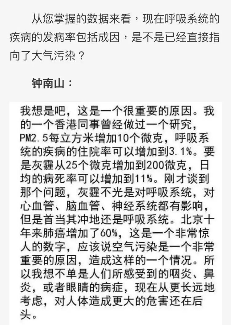 在《雾霾比非典可怕》的文章中,钟南山面对记者的提问曾回答: