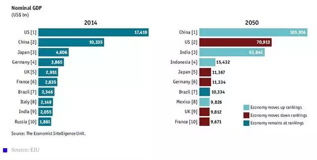 经济学人集团旗下的经济学人智库(EIU)预计,到2050年,中国、美国和印度会成为全球前三大经济体,墨西哥和印尼会取代俄罗斯和意大利,打入世界经济十强。