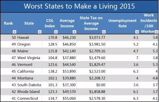 MoneyRates.com综合考虑了每个州的平均薪资、税收、生活成本、失业率等状况,对美国各州谋生难易度进行评选,信息收集自美国劳工统计局、社区和经济研究委员会和智囊团税收基金会。