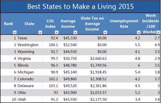 得克萨斯州凭借着低于平均值的生活成本,最大程度地放大了其仅仅略高于平均值的薪酬水平。极低的生产安全事故发生率以及免征个人所得税使得得克萨斯州称霸榜首。