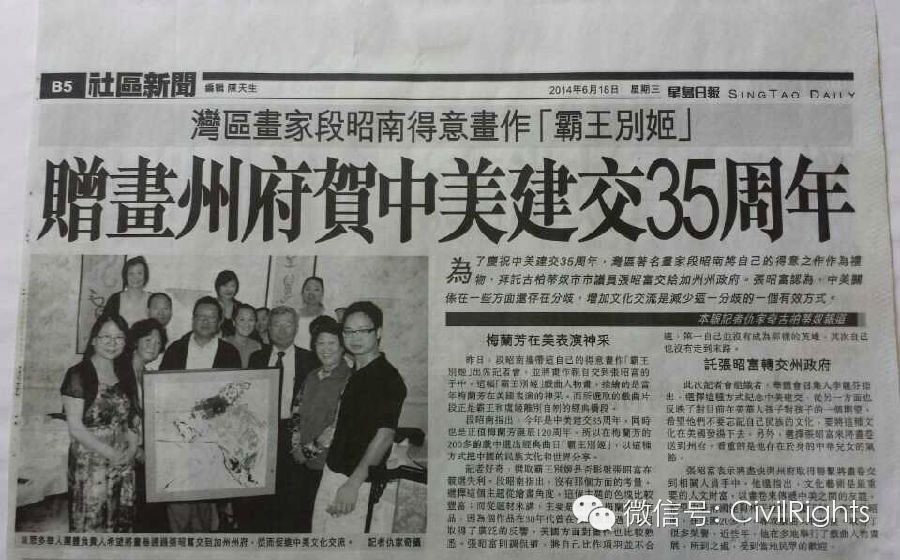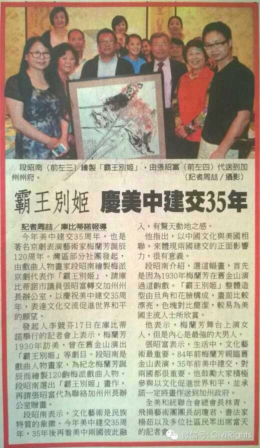 今年是中美建交三十五周年,在张昭富先生的感染下,著名的戏画大师段昭南老师决定将他的力作《霸王别姬》送给张先生,由张先生送给加州州政府,以促进中美友谊,推动世界和平。