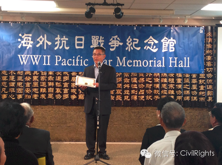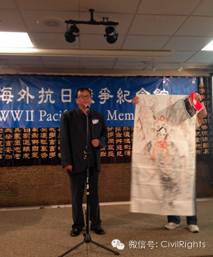 丁元先生則展示了他特地回國從臺灣帶來的對聯:“抗日戰爭勝利,中華民族復興”。該對聯來自抗戰老兵郝柏村先生。令人印象深刻的是,丁先生在發佈會之後,還積極地和Milpitas市長艾和諧進行了交流,為推動在該市建立慰安婦紀念碑努力。