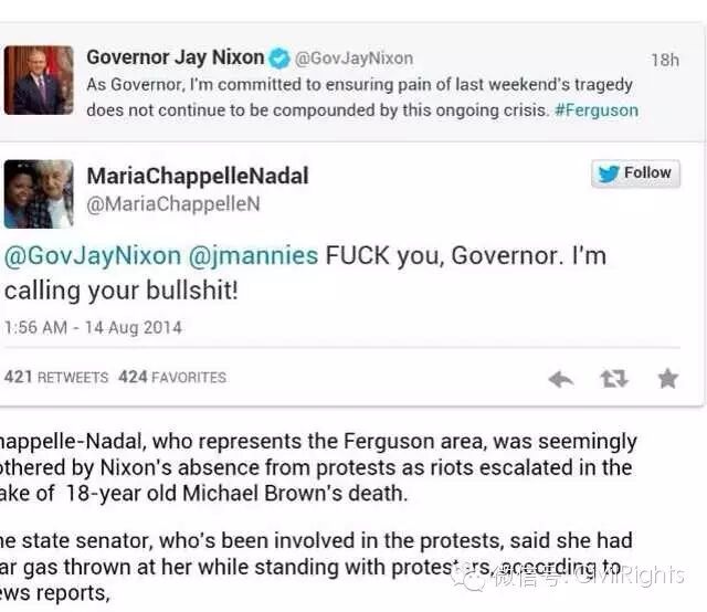各位看官,封面图片是否够劲?大概就是:米国密苏里省委书记Nixon对发生在圣路易斯的骚乱表达遗憾,希望他能够努力使得这种伤痛不再继续。圣路易斯的人大代表Nadal怒斥,X你,省委书记,我叫你狗屎!