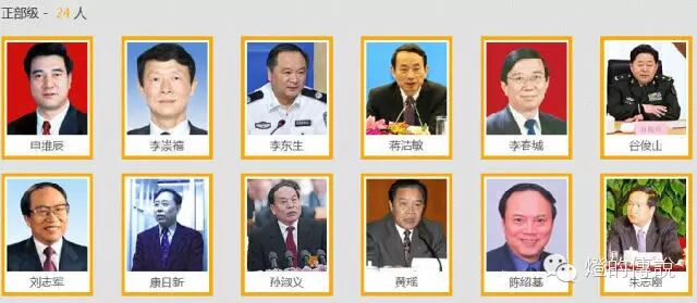 正部级6人:申维辰、李崇禧、李东生、蒋洁敏、李春城、谷俊山。