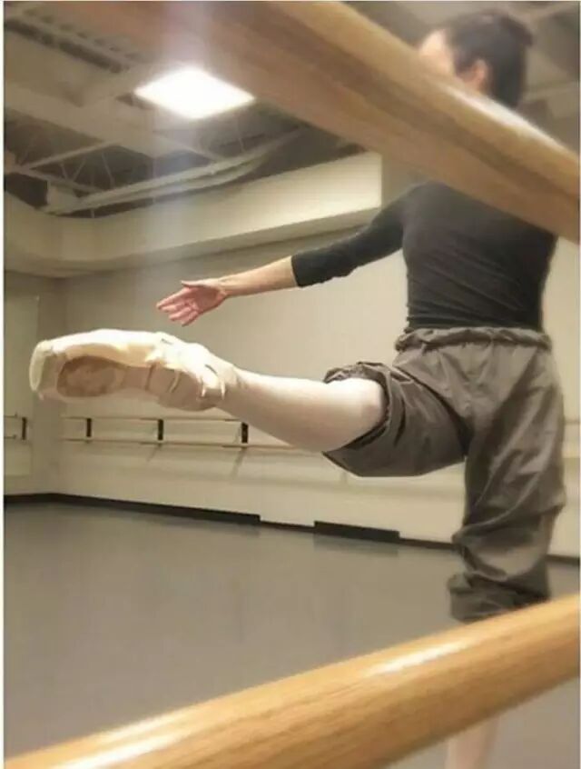 外侧的腿搭在把杆上,膝盖不可以弯,主力腿打开,也就是脚尖要向外。注意,后腿是侧搭上的,不是完全的后“面”向上的,如果感觉这样还可以的话,那就试着向后弯腰,用手够脚尖,抓脚。踢后腿有两种,一种直着踢,要控制住,另一种膝盖可以弯,上身可以稍稍向前倾,踢的时候能看到腿那就不错了。