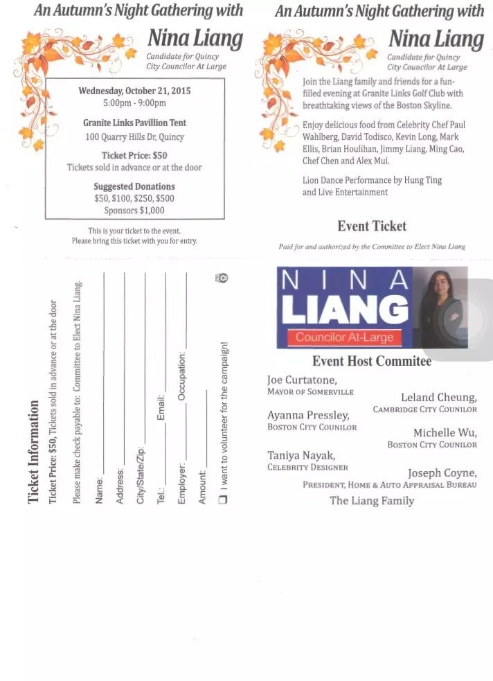 为”An Autumn’s Night Gathering with Nina Liang"的政治竞选筹款会。届时,Nina Liang将就自己下一步的竞选目标和政治宣言与来宾进行交流。