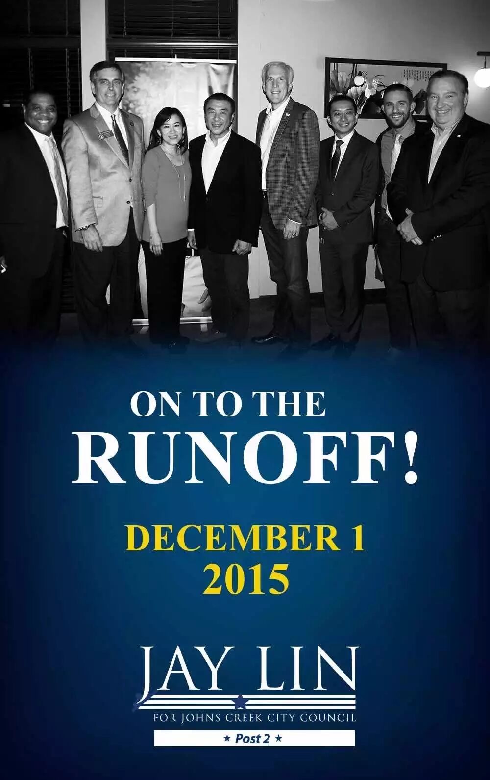 Jay Lin 竞选团队肖宇写到:感谢大家的关注。选团队刚刚结束会议。我们需要整理一下思路,听听大家的建议。基本数字如下:共有4345人投票,远远低于我们估计的6700票。我们得了43.7%的票,比排名第二的Chris Couphlin的28.2%高出15%。在Post 5,Nazeera得票39.1%,而Stephanie得到49.1%,差约40票未能直接胜出!Runoff的日期应该是12月1日,仍然可以提前投票和缺席投票。今天在漂亮餐厅至少有60人共同见证开票,包括市议员Bob Gray,州议员Brad Raffensperger,David Clark,GOP地区主席Michael Fitsgerald等等。虽然我们未能直接胜出,这一结果充分肯定了我们过去半年的努力。我们再加一把力,保持旺盛的斗志,一定会一举拿下选举。我们会陆续分析数据,制定战略,并随时跟大家汇报。谢谢。