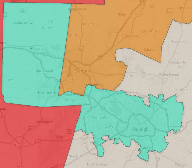 文中透露,2016年2月重划后的北卡罗来那第四国会选区-NC4, 仍然位于该州中北部地域。包括Orange County 全部,Wake County 540 内大部分, 以及Durham County 54号公路以南。选区地理由原来自北向南的极不规则形状(即所谓“蝾螈选区”),朝北部主体极剧收缩(下图2红色区域),成为中间相连接的两块儿地域。