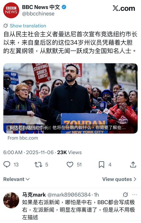 「這次伊斯蘭共產分子馬姆達尼贏得紐約市長選舉,主要靠黑人、西裔、華人集中的布魯克林區和皇后區(在白人為主的史泰登島,他慘敗)。華人,尤其是中國大陸出身的,再支持伊斯蘭共產分子,是不可饒恕的愚蠢。
