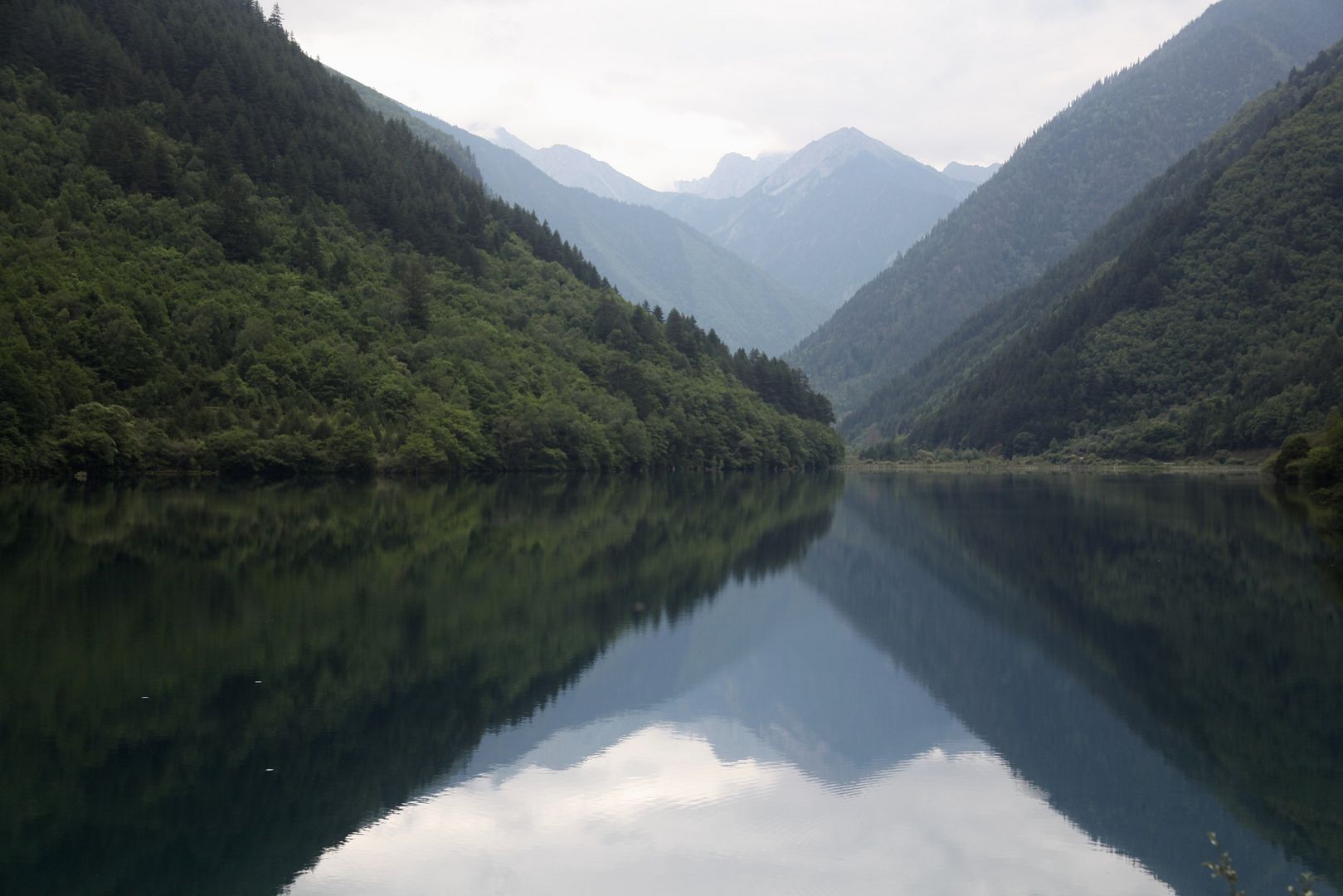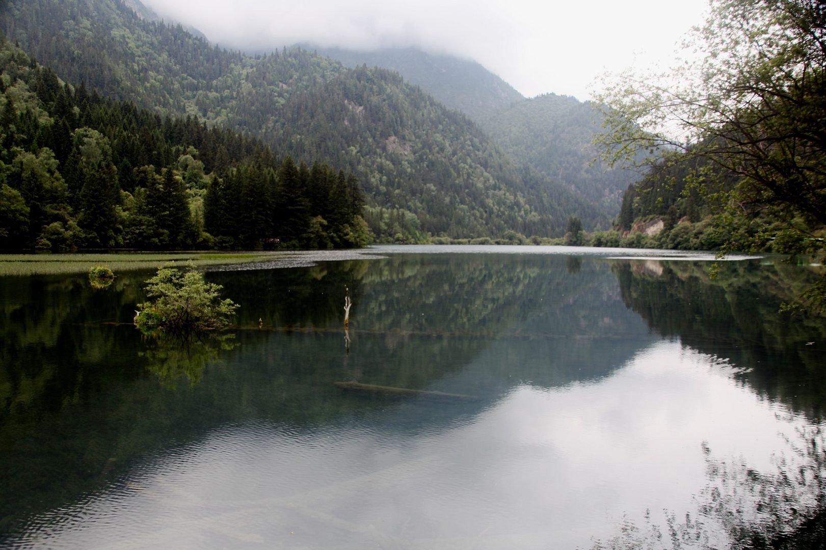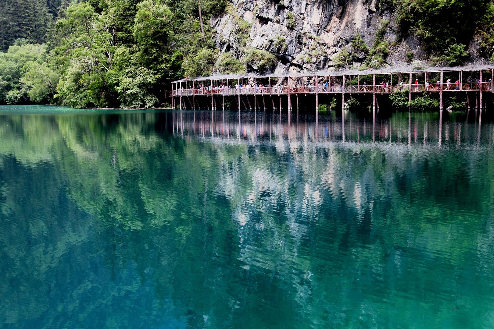 镜海一平如镜,故得其名。湖呈狭长形,长约一公里,为林木所包围。对岸山璧像一座巨大的石屏风。镜海的倒影在水的天堂九寨沟独领风骚,它借湖面这面镜子,将地上和空中的景物毫不失真地复制到了水里,又比原像多了几分深邃、优雅和灵动。
