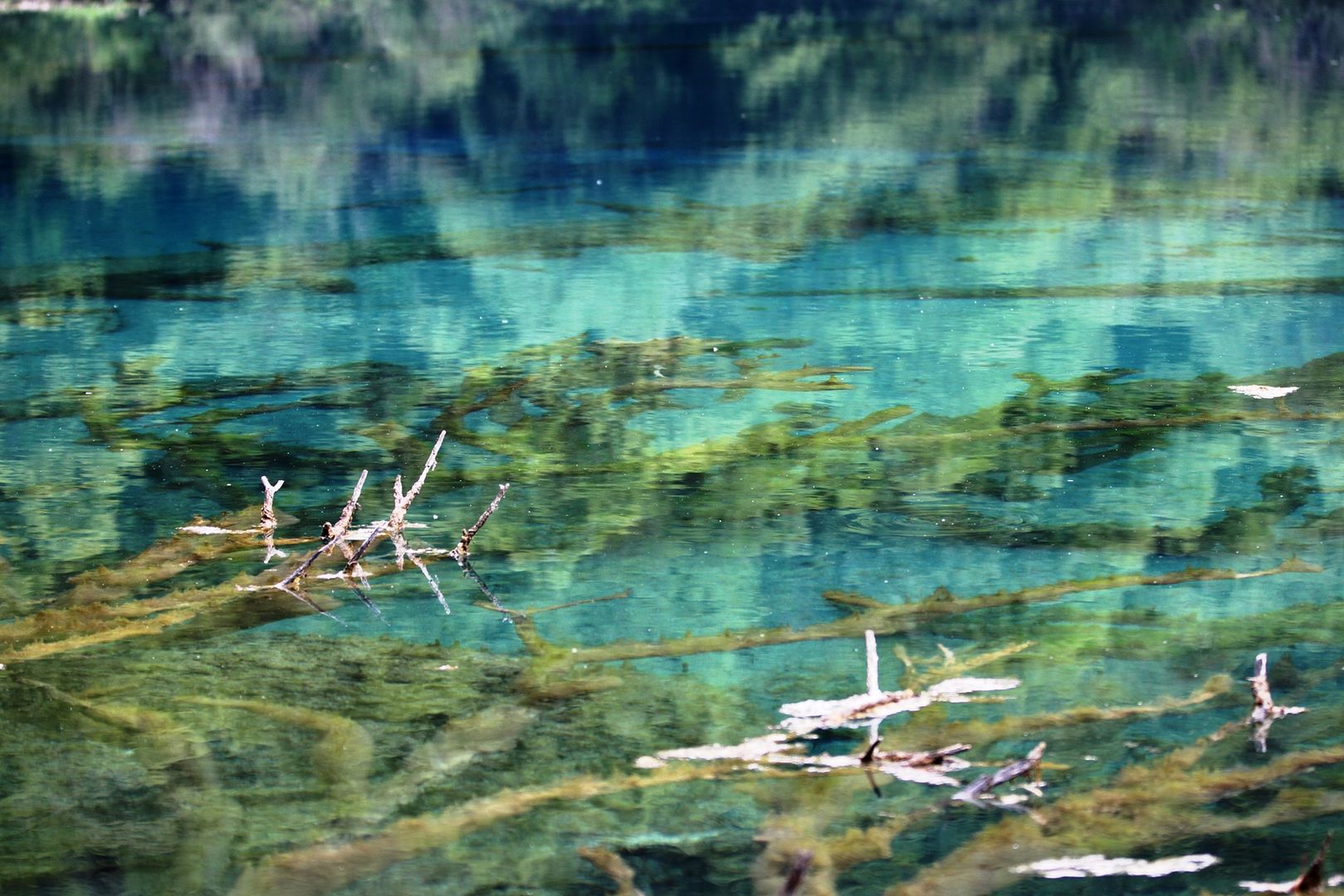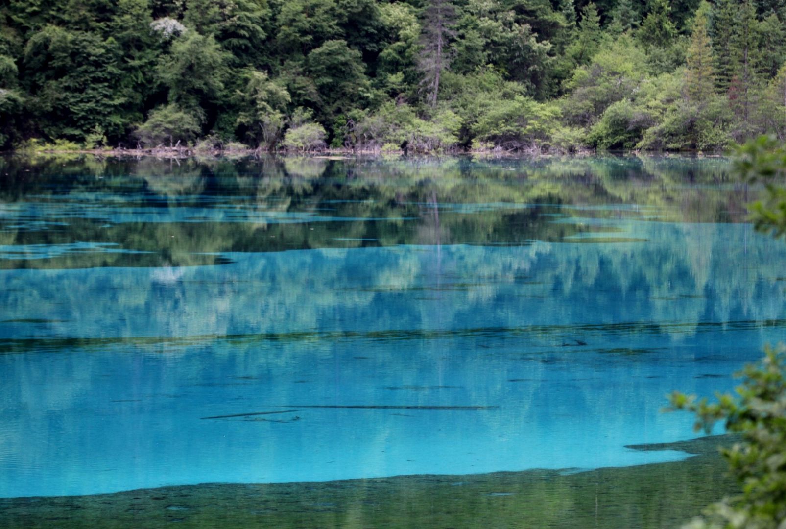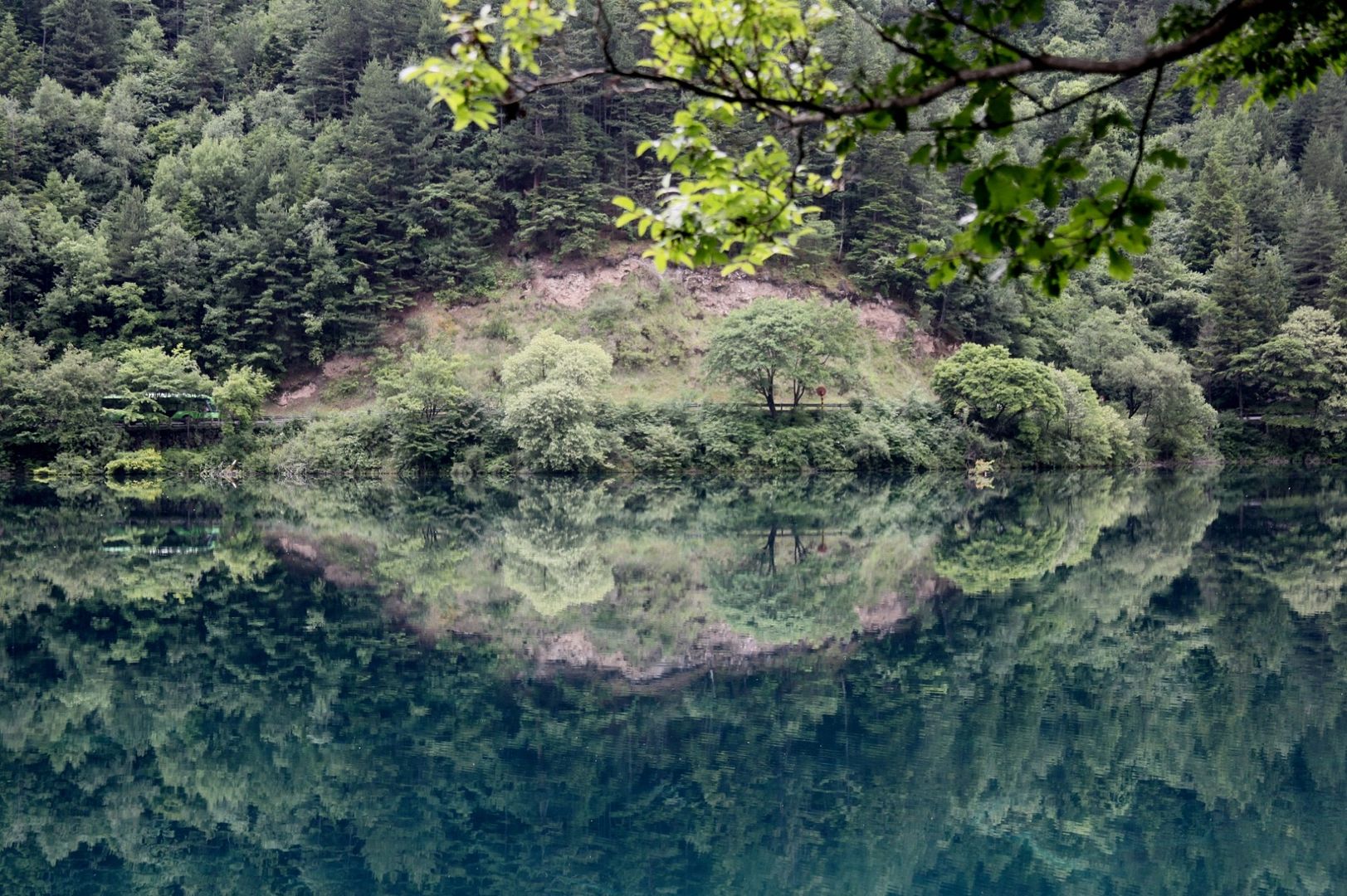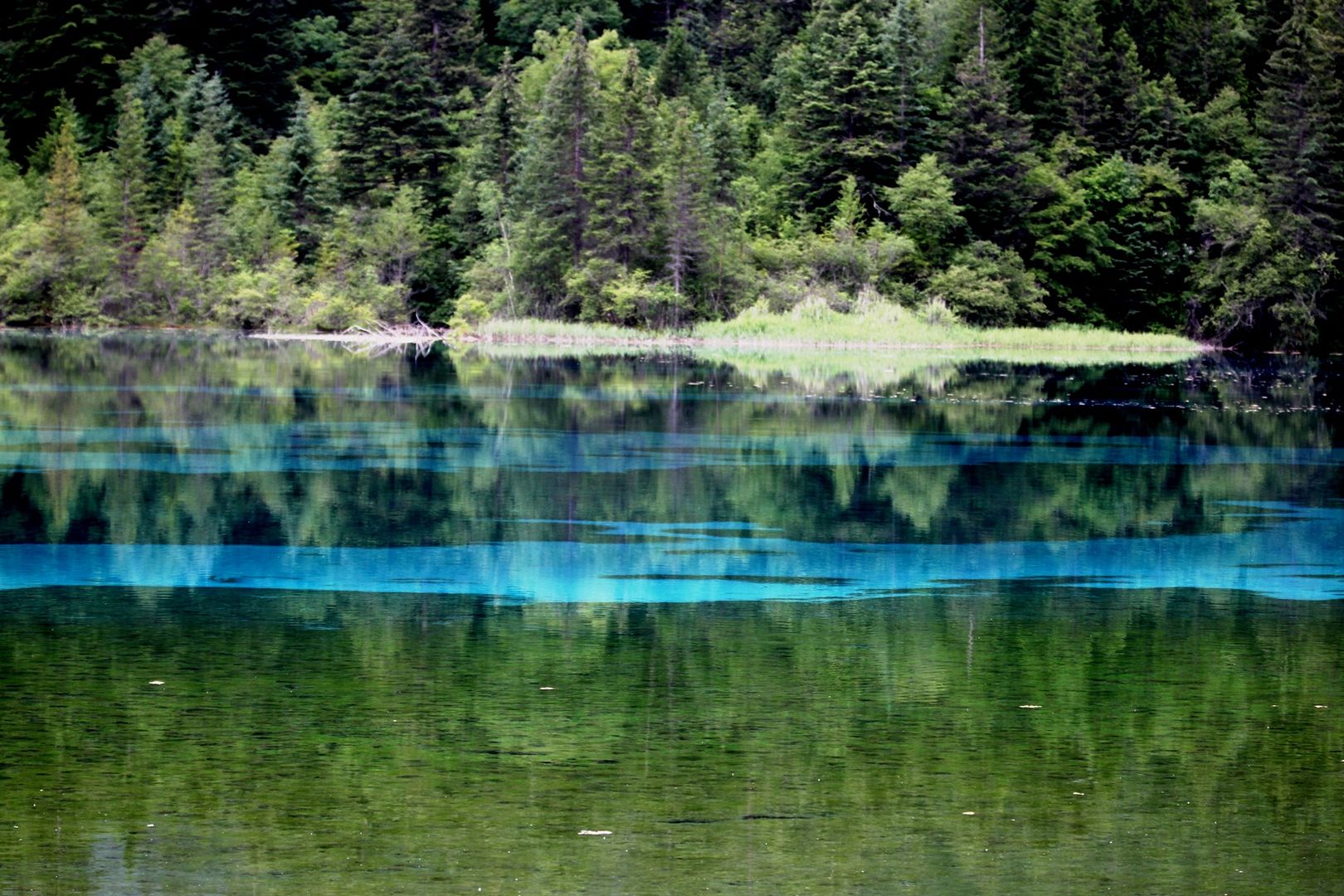 五花海用倒影魔镜演变幻化着树上的枝丫(化绿成蓝)。。。