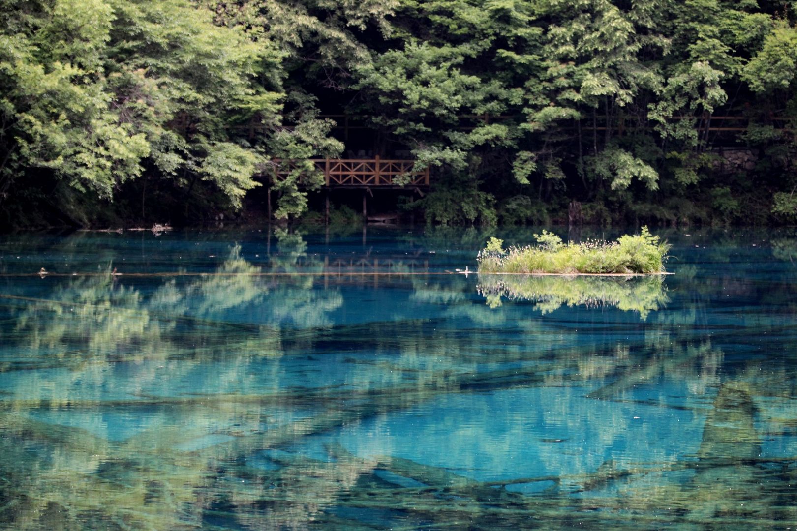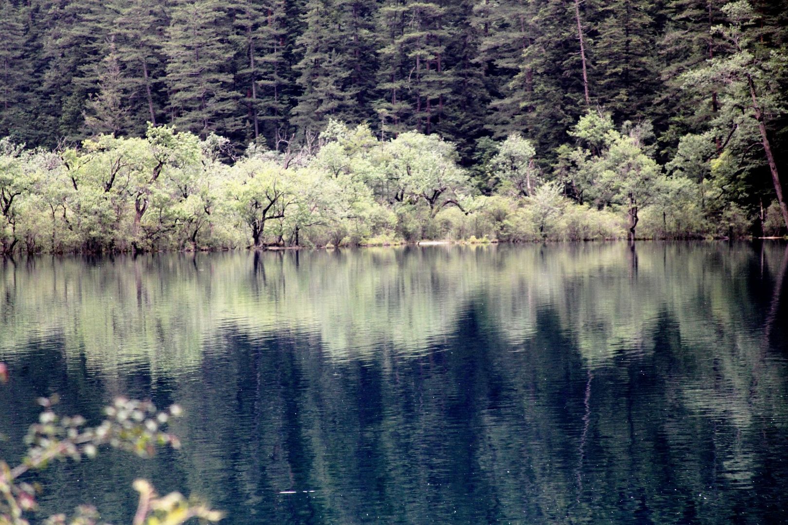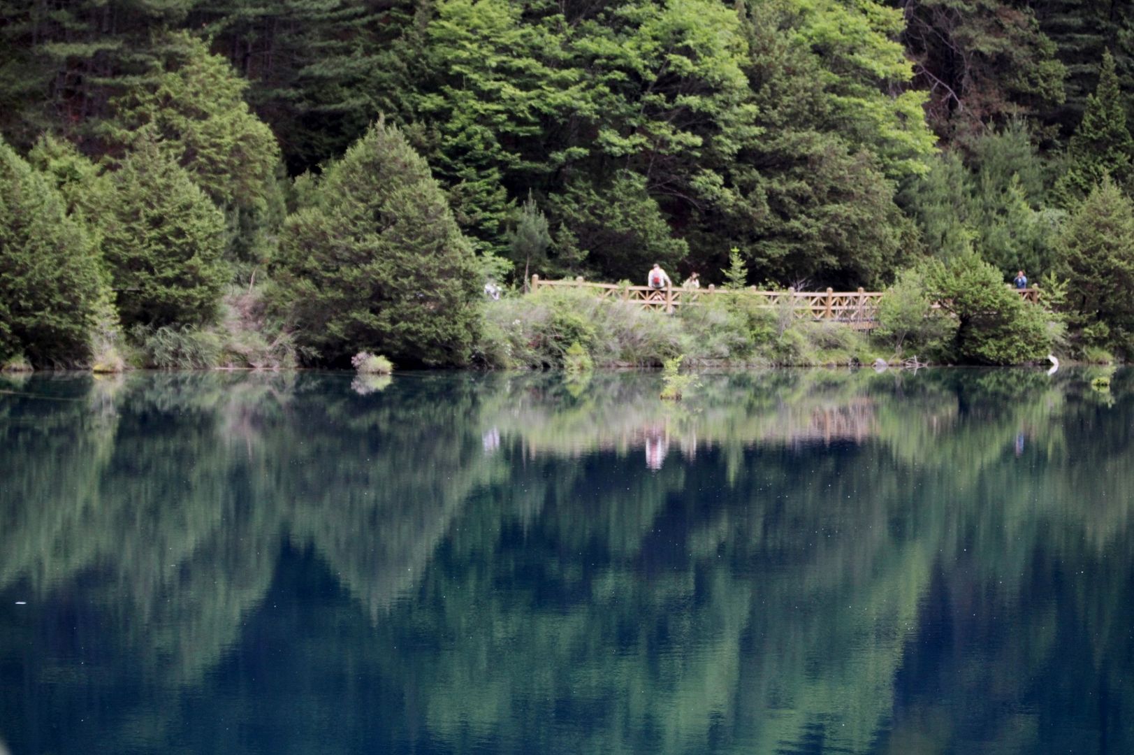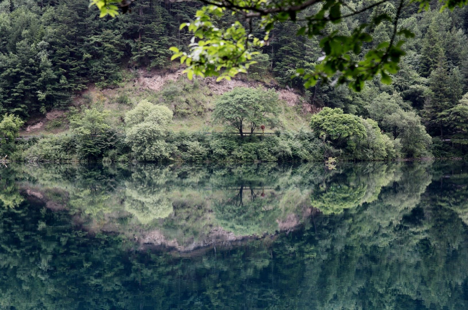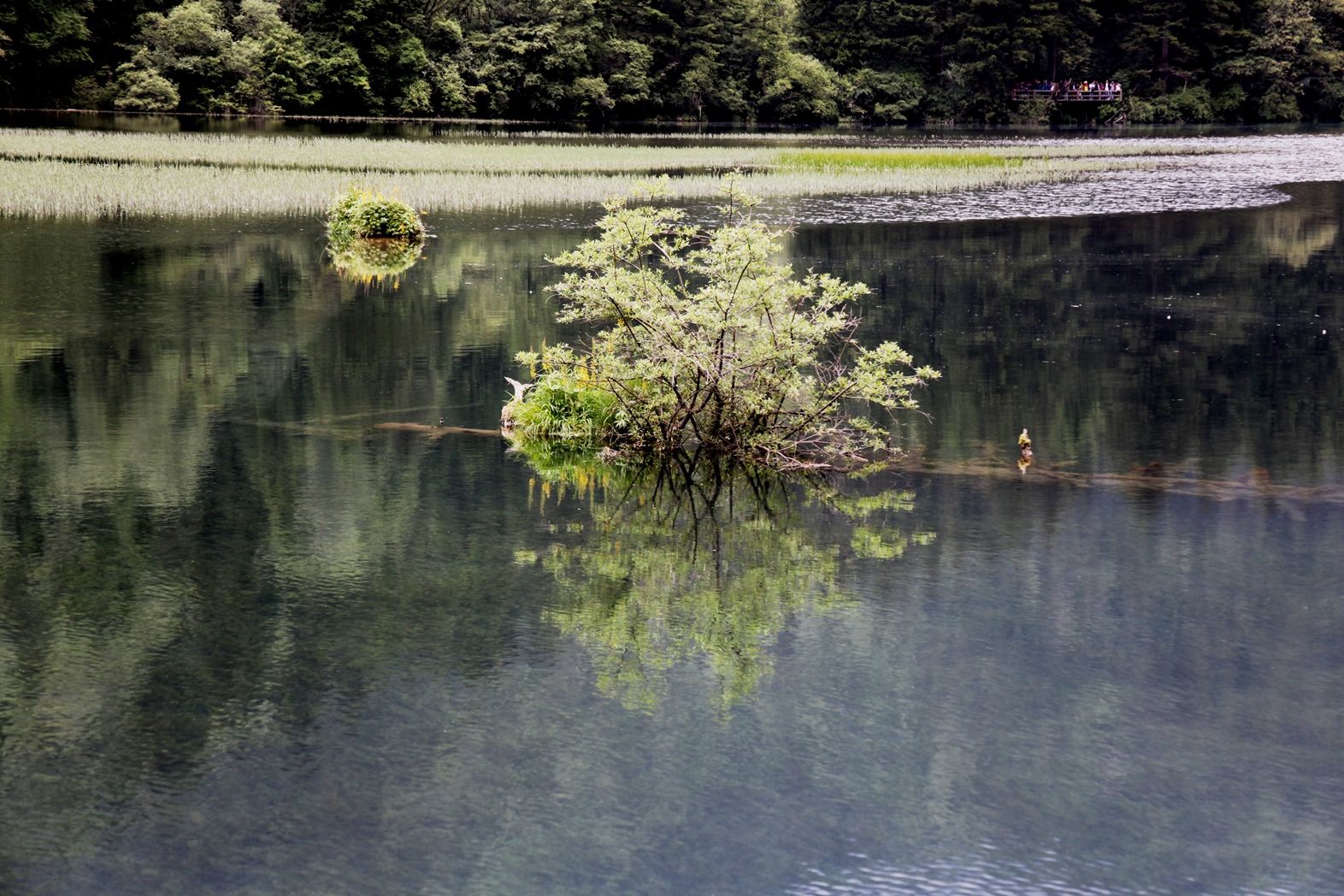 五花海用倒影魔镜演变幻化着树上的枝丫(化绿成蓝)。。。