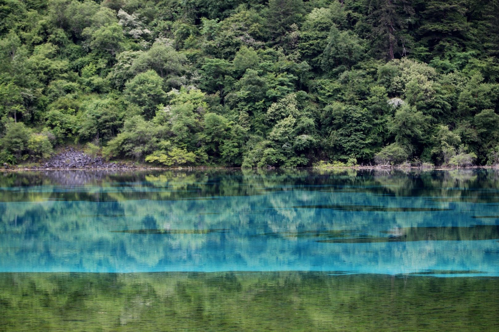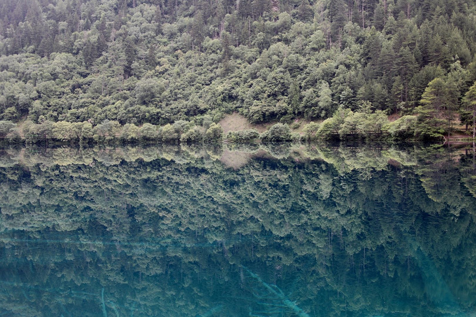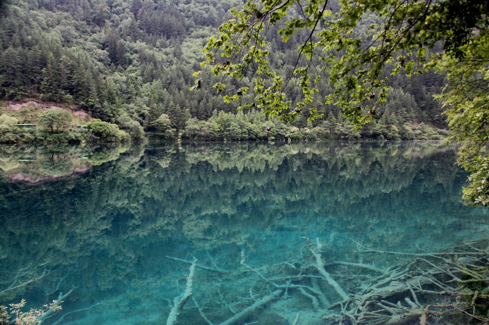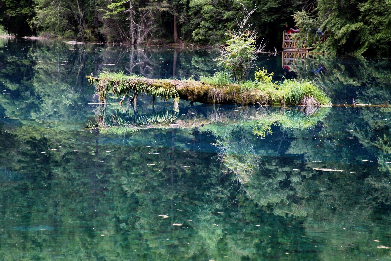 五花海用倒影魔镜演变幻化着树上的枝丫(化绿成蓝)。。。