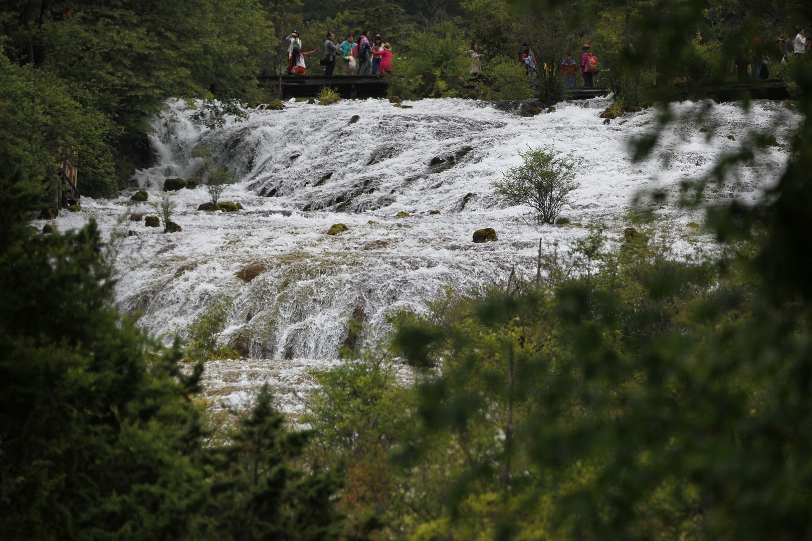 五花海往东南下行不远就到珍珠滩,电视剧《西游记》片头中唐僧师徒牵马涉水的地方。长约100米的水流,在这片坡度平缓、长满了各种灌木丛的浅滩上,展示珍珠般日夜跳跃不息的景观,故名珍珠滩。之所以“大珠小珠落玉盘”是因为这段峡谷恰好是坡度为20度的钙华地带,加上多孔的“生物喀斯特”地貌特征,大小各异,水流至此,漫滩铺开,被遍布河床的微小孔隙所阻,便生出团团簇簇成千上万的水珠来,在阳光照射下,晶莹夺目,就象满坡满沟滚动着晶莹的珍珠一般。