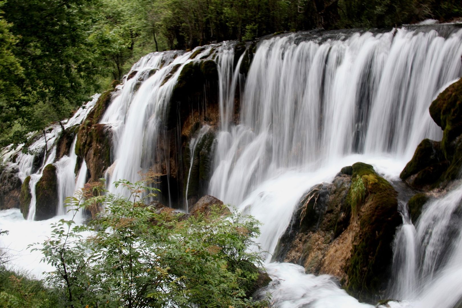 珍珠滩下,水流开始从一高40余米的悬崖上跌落下去,形成著名的珍珠滩瀑布。珍珠滩瀑布高21米,顶端宽162.5米,最大落差可达40米。她是九寨沟所有激流中水色最美,水势最猛,水声最大的一段。