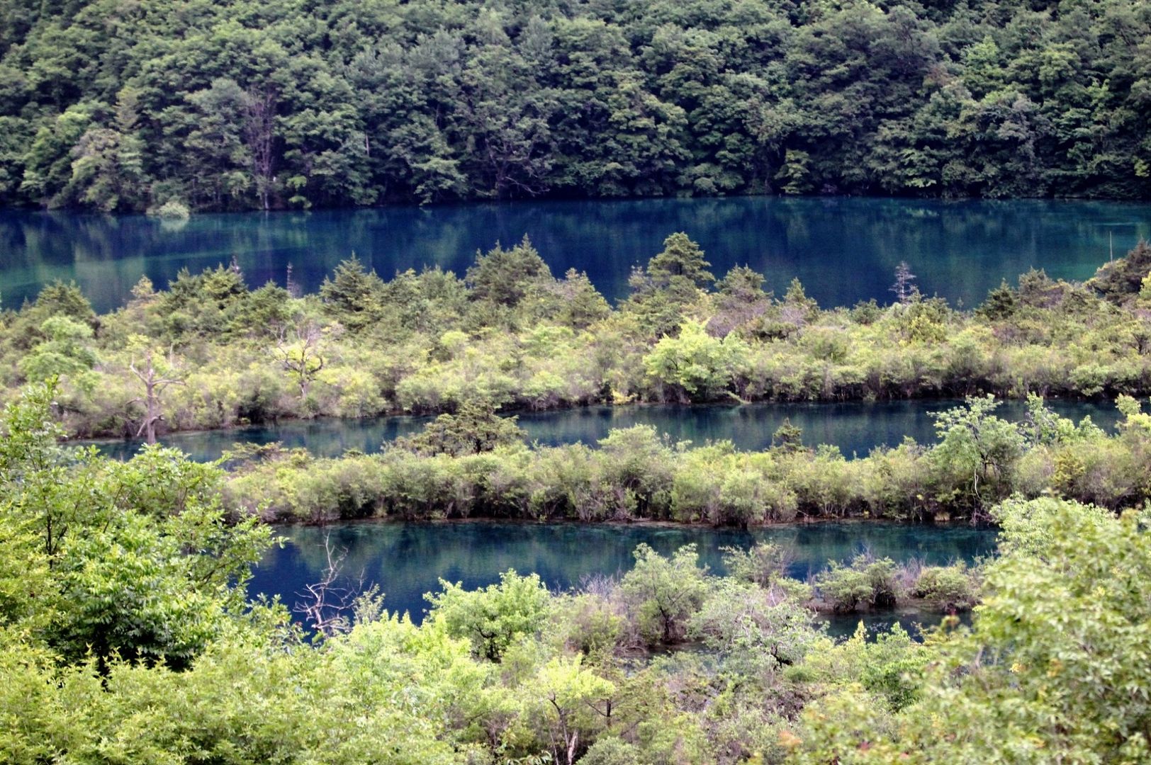 五花海就是这么神奇,整体呈绿松色的湖面不可思议却不着痕迹地镶嵌着大片的宝蓝色绸缎。