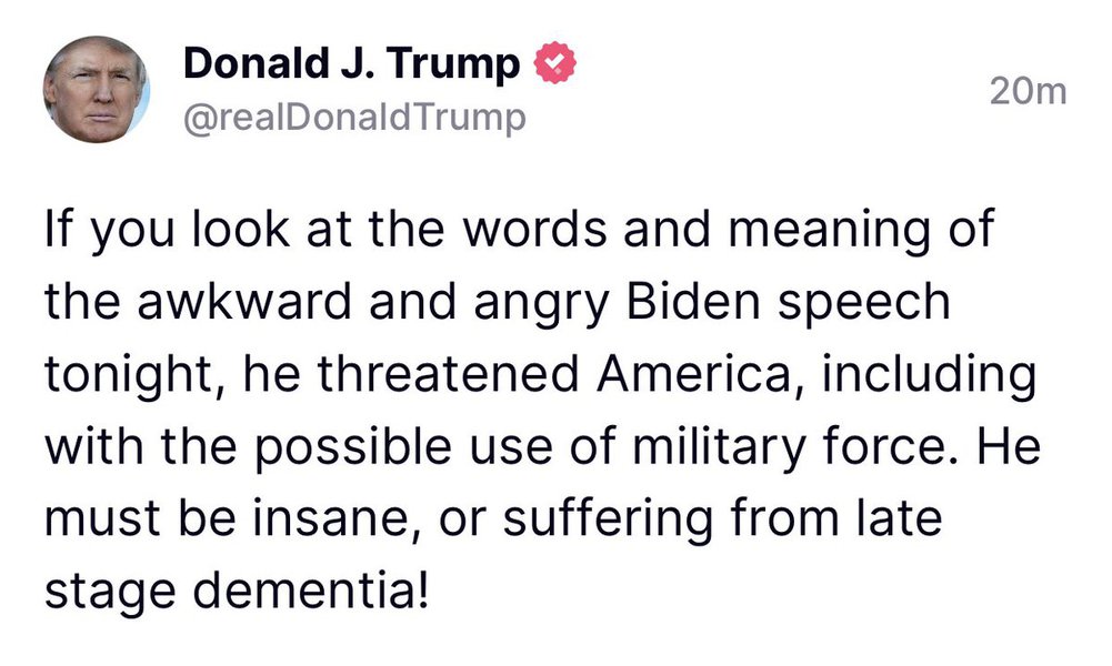 川普在“Truth Social”发出一张组图,左边是拜登在投射暗红灯光的讲台上握拳振臂疾呼,右边则是他自己抱著美国国旗大亲特亲,同时还写到,“如果你看到尴尬愤怒的拜登今晚演说的文字与涵义,他威胁美国,包括了可能动用军力,他一定是疯了,或者罹患晚期失智!”