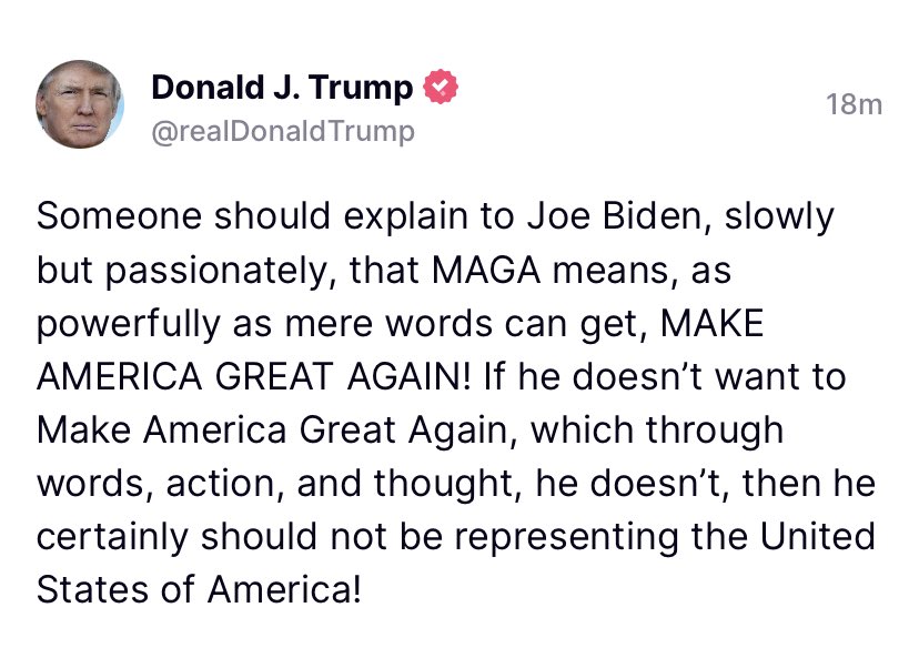 根据每日邮报报道与网友在推特转发的截图,川普在“Truth Social”发文表示,“有人应该跟拜登解释,缓慢、但热情地说,MAGA的意思是,跟单凭文字就能知道的一样有力,『让美国再度伟大!』”。川普指出,如果拜登不想通过言语、行动和思想让美国再度伟大,“他没有、那他当然不该代表美利坚合众国”。