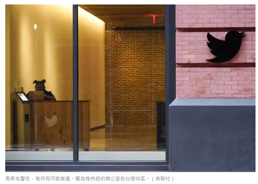根據彭博资讯、路透、华尔街日报及英国金融时报(FT)等重量级媒体都报道,马斯克日前对推特员工发出最后通牒,要求在全新“铁腕”而“长工时高强度”的环境下工作后,拒签这份承诺书的员工人数比预期多出不少,这可能危及推特的日常营运,也让这家社媒平台的未来面临更多不确定性。