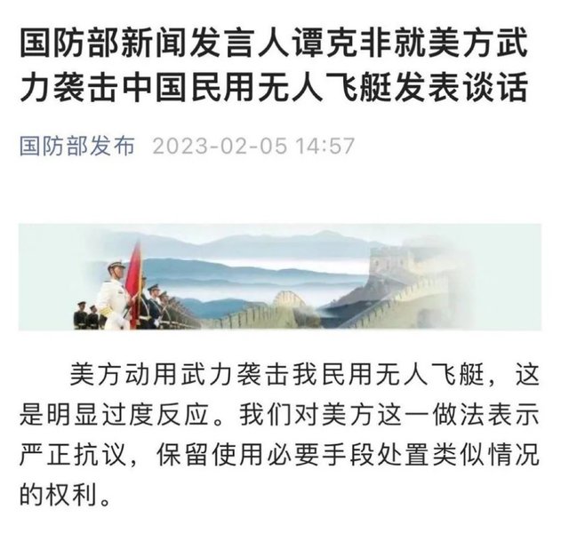 中國外交部發言人毛寧說:中國的“流浪气球进入美国领空纯粹是一个无意的、意外的和孤立的事件。然而,它考验了美国是否有稳定和改善与中国关系的誠意,以及是否能妥善处理危机。”